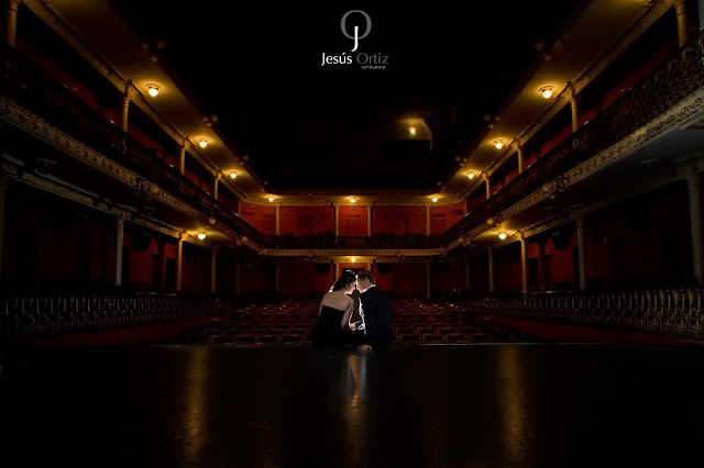 Actualmente, os confieso que llevo varios años sin subirme a un escenario y tengo mono, tengo mono de luces, de nervios, de aplausos… Así que cuando hace unas semanas Miriam , seguidora del blog se puso en contacto conmigo y me mostró las fotografías de su preboda más teatral, me enamoraron. Miriam & Luis son una paraeja apasionada por el teatro y por ello tuvieron la idea de realizar su preboda en el Teatro Cervantes (Abarán), un lugar muy especial para ellos ya que allí tuvieron una de sus primeras citas y han vivido experiencias que no olvidarán nunca. Su historia de amor se ha ido forjando en las paredes de este teatro viendo en él: obras de teatro, películas, ópera… Querían que su preboda tuviera un aire vintage pero sin recargar demasiado la escena, así que poder darle un toque retro en el teatro que ha visto crecer día a día su relación fue la decisión perfecta.