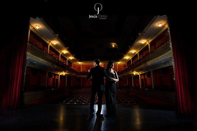 Actualmente, os confieso que llevo varios años sin subirme a un escenario y tengo mono, tengo mono de luces, de nervios, de aplausos… Así que cuando hace unas semanas Miriam , seguidora del blog se puso en contacto conmigo y me mostró las fotografías de su preboda más teatral, me enamoraron. Miriam & Luis son una paraeja apasionada por el teatro y por ello tuvieron la idea de realizar su preboda en el Teatro Cervantes (Abarán), un lugar muy especial para ellos ya que allí tuvieron una de sus primeras citas y han vivido experiencias que no olvidarán nunca. Su historia de amor se ha ido forjando en las paredes de este teatro viendo en él: obras de teatro, películas, ópera… Querían que su preboda tuviera un aire vintage pero sin recargar demasiado la escena, así que poder darle un toque retro en el teatro que ha visto crecer día a día su relación fue la decisión perfecta.