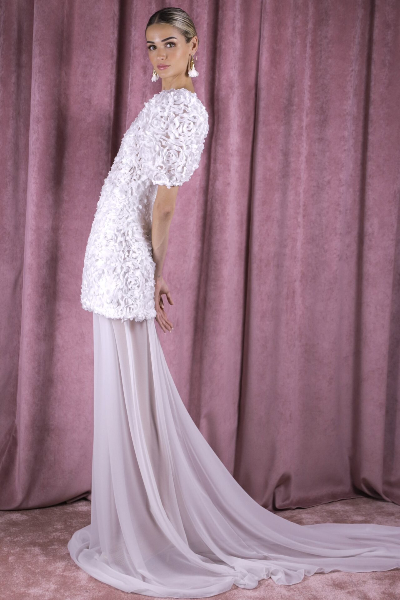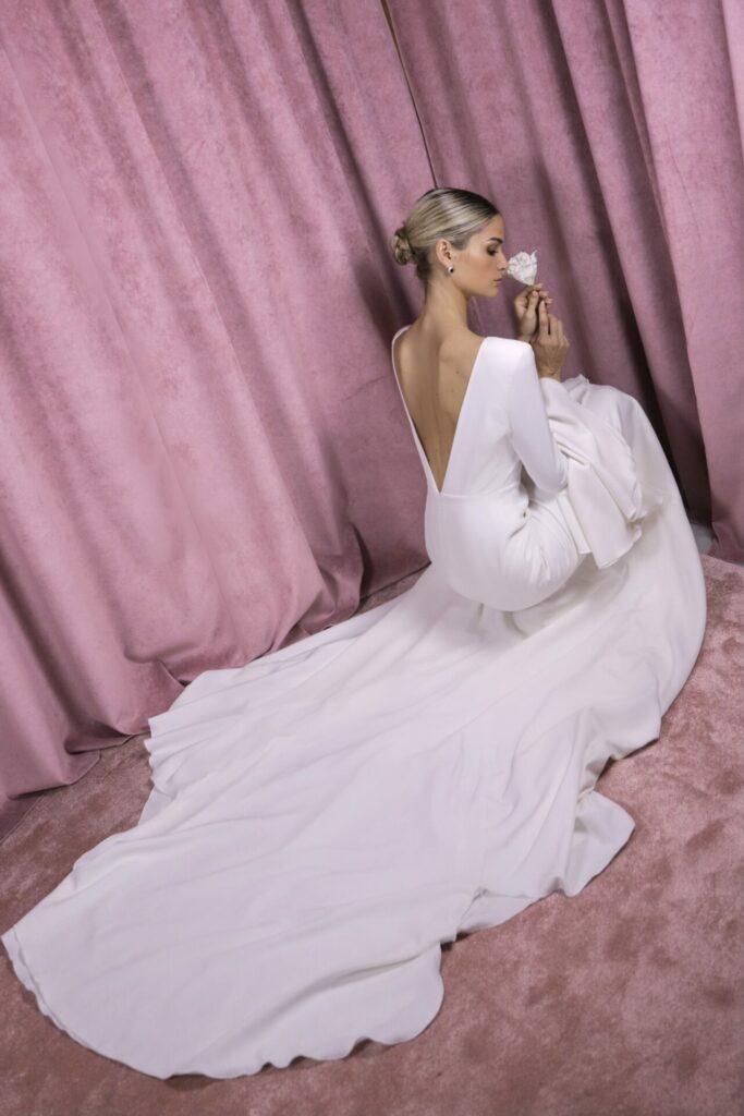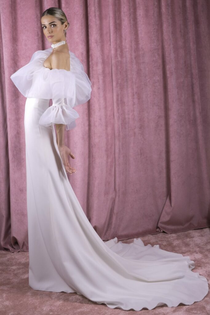 Un vestido de silueta entallada en crepé pesante, con volante midi y una espalda rectangular abierta que aporta sensualidad sin perder sobriedad. Una propuesta ideal para novias que buscan equilibrio entre tradición y vanguardia.