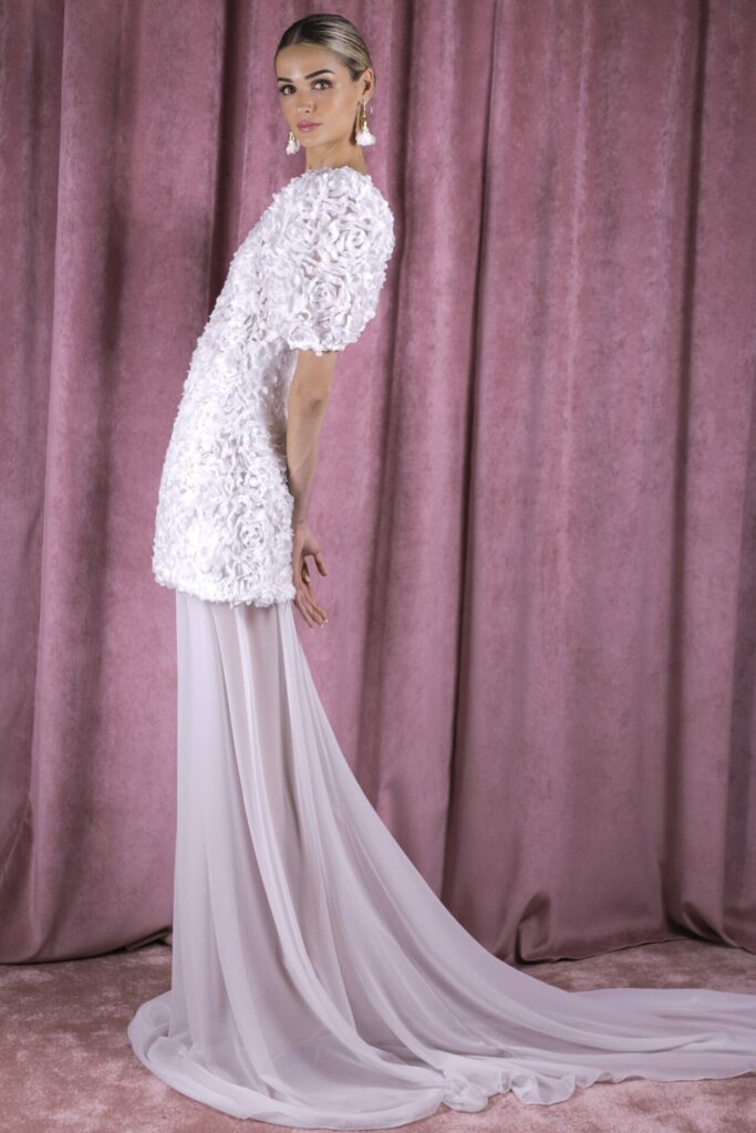 La firma combina estos materiales para crear looks llenos de armonía, donde cada diseño celebra el amor y la fuerza de la mujer que lo lleva.
