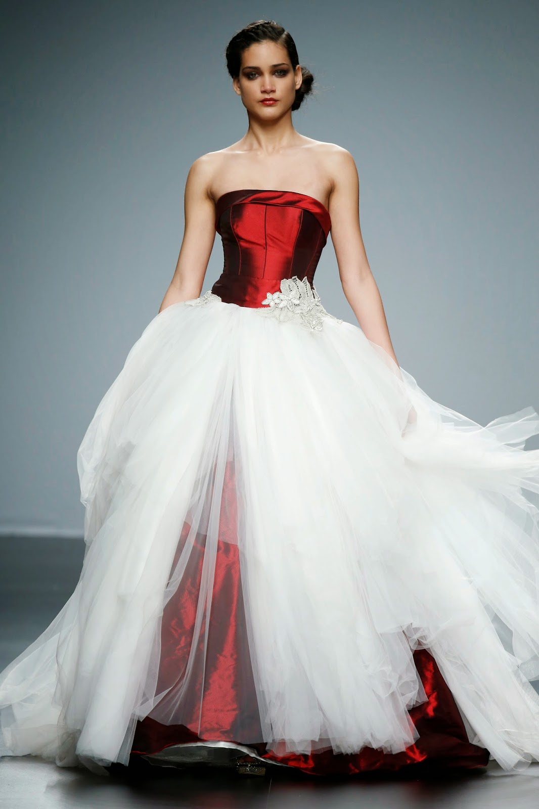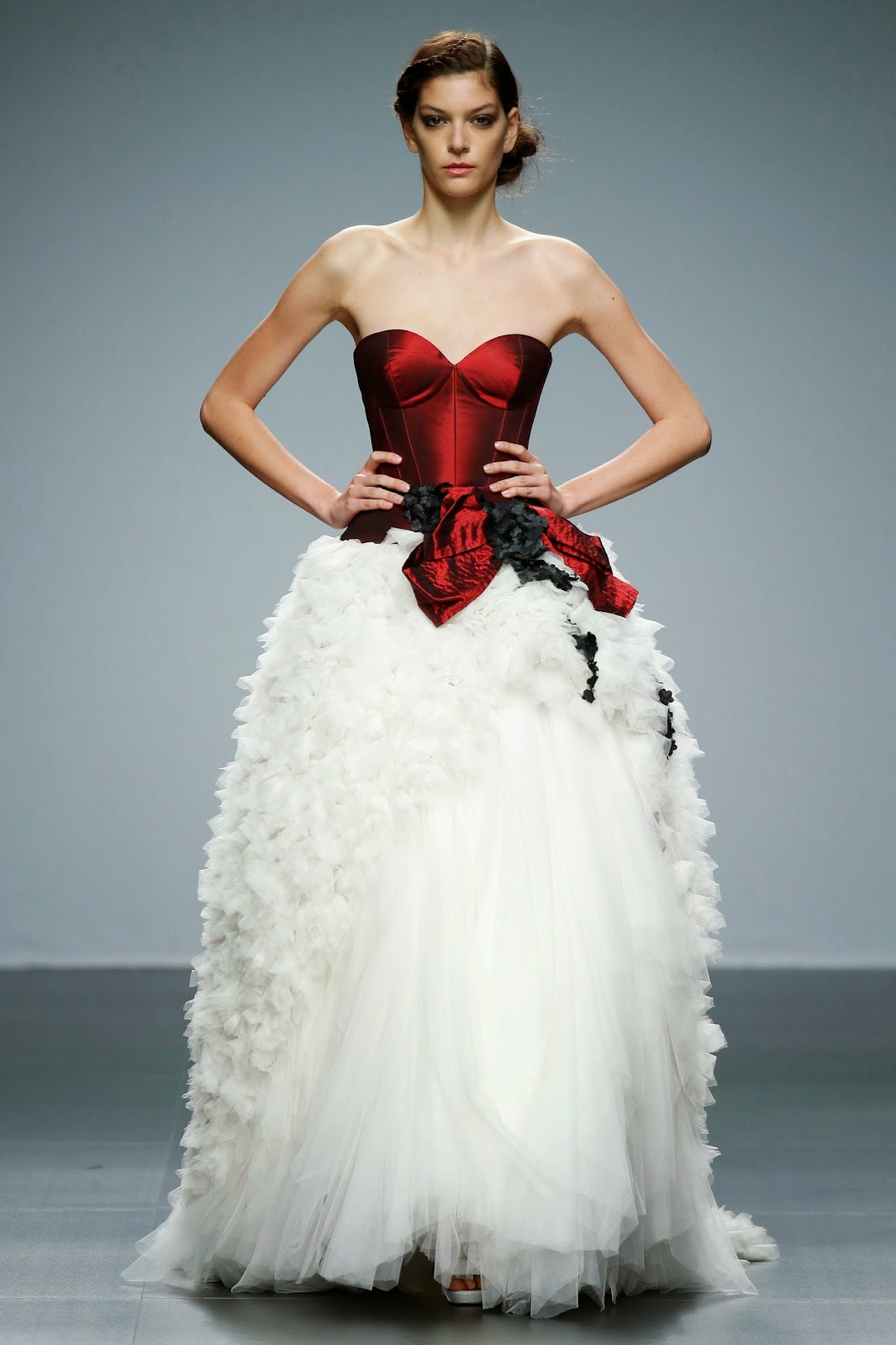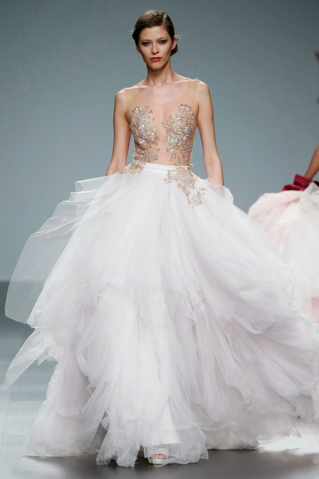 Los materiales utilizados esta temporada van de las sedas naturales a los mikados, transparencias, encajes y brocados. Como novedad, muchos de los diseños se completan con detalles bordados de pedrería que se unen a lazadas inacabadas, aunque el contraste lo siguen aportando las múltiples sobrefaldas de ‘quita y pon’, seña de identidad de la firma desde sus incios.