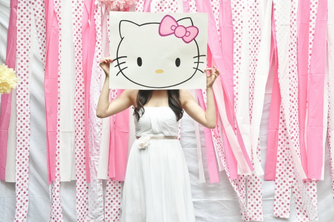Todos sus detalles y la decoración podría haber estado elaborado por las amigas de la novia. Ya sabéis que me encantan las manualidades y os tengo que decir me alucina el photocall que han elaborado con papel crêpe en tonos rosados y la super Kitty para fotografiarse junto a ella.