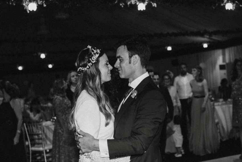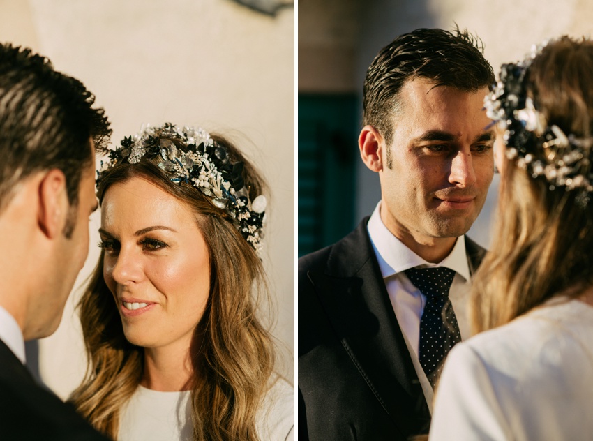 Como si de dos bodas se tratara Paloma escogió dos vestidos distintos para su gran día. Para la boda religiosa que se celebró primero, escogió un vestido vintage de encaje heredado de su abuela, una reliquia familiar con el que lucía espectacular, acompañado por un bouquet nupcial elaborado por Margarita se llama mi amor. El segundo vestido de novia de manga larga, conjuntado con el maravilloso tocado de flores y estrellas fue una creación de Suma Cruz y zapatos de Uterqüe, una combinación perfecta para una novia muy estilosa y muy femenina que vistió en la boda al aire libre.. Paloma como si de una heroína se tratara escogió una alianza diferente, original y muy atrevida de la firma de joyas Aristocrazy. Edu escogió un traje elegante y sobrio de Hackett, el cuál conjuntó con Paloma luciendo unos extraordinarios gemelos de Suma Cruz.