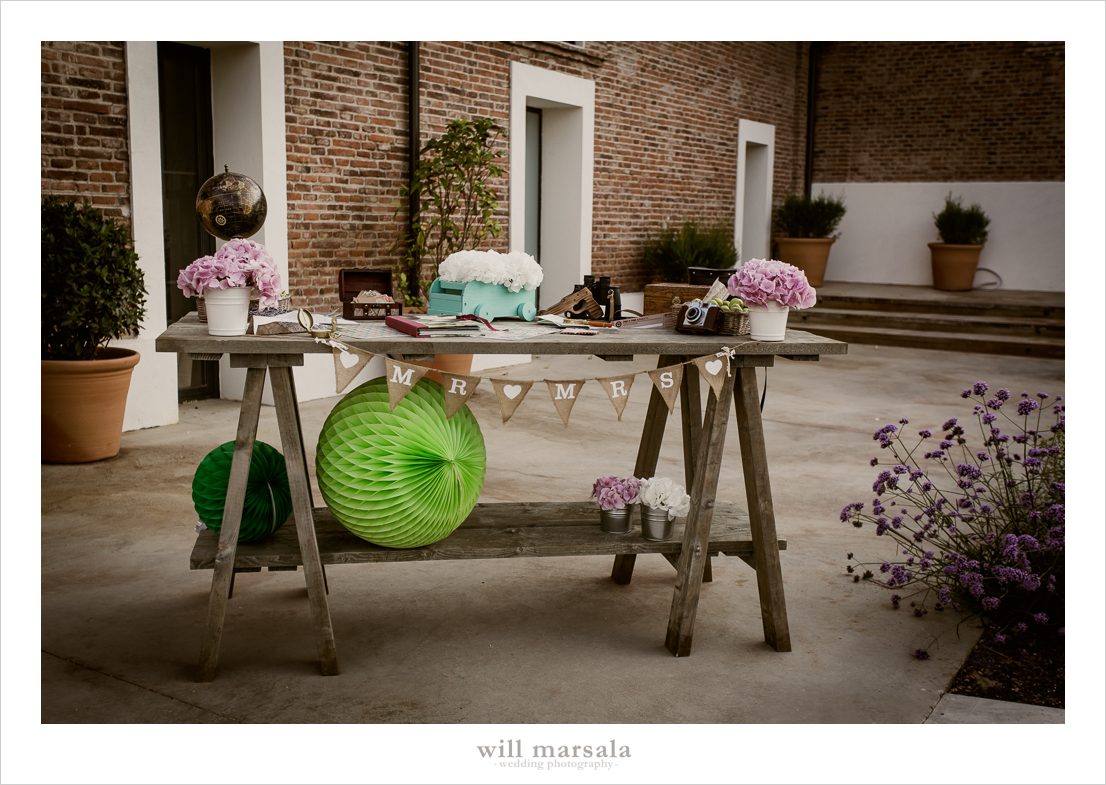 El hilo conductor de su boda fue la película de la factoría Pixar: UP y la decoración giró entorno al mobiliario tan característico del film. La ceremonia se celebró en un cálido saloncito en el exterior de la Finca Casetón de las Arenillas, donde no faltaron unas butacas para los novios, muebles antiguos, algunos rescatados de la finca donde se casaron y otros alquilados en Memorias del Ayer, una alfombra artesanal de Leo y Lea Shop y un pasillo impresionante lleno de hortensias de Qué de Flores en tonos pastel para no desentonar con los tonos presentes en la ceremonia.