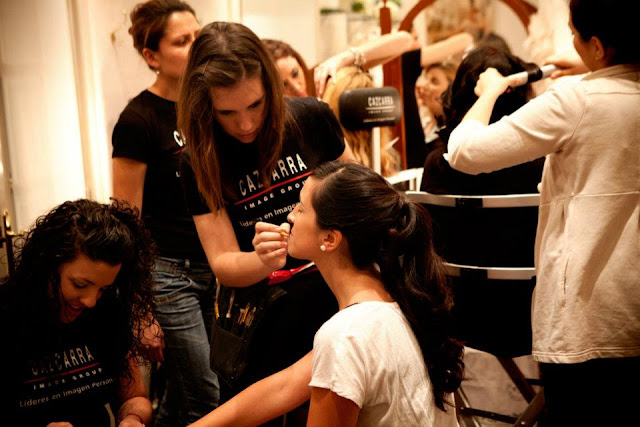 Un grupito muy reducido de bloggers (Andrea de Se Lleva en La Vanguardia, Sara de PoppyJota, Miss Lemonet y yo) íbamos a ser las afortunadas de probarnos los vestidos de novia y fiesta que Eugenia Santiago tiene en su atelier. Pero antes tuvimos que pasar por chapa y pintura para lucir como unas auténticas novias. Gracias al equipo de Cazcarra que nos maquillaron, peinaron e hicieron la manicura pudimos estar espectaculares aquella tarde.