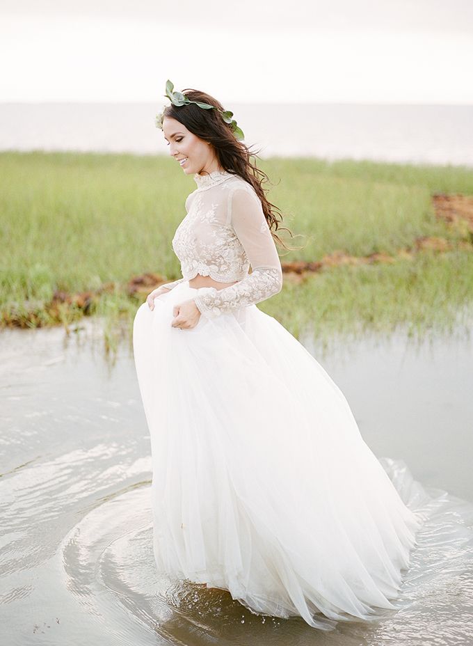 Los vestidos con crop top se caracterizan por estar dividido en dos piezas, dando mucha importancia al cuerpo del mismo, ya que marca mucho la figura aportando así sensualidad, romanticismo y mucha feminidad a cualquier novia que se precie. La pedrería o el encaje son ideales para la elaboración de un top que se funda con la silueta de la novia, pudiendo combinarlo con una falda larga del mismo material o romper con todo y apostar por una falda corta de tul. Las faldas asimétricas también serán una opción estupenda para lucir unos zapatos joya o, incluso, con pantalones lucirá muy elegante y será una novia con mucha personalidad.