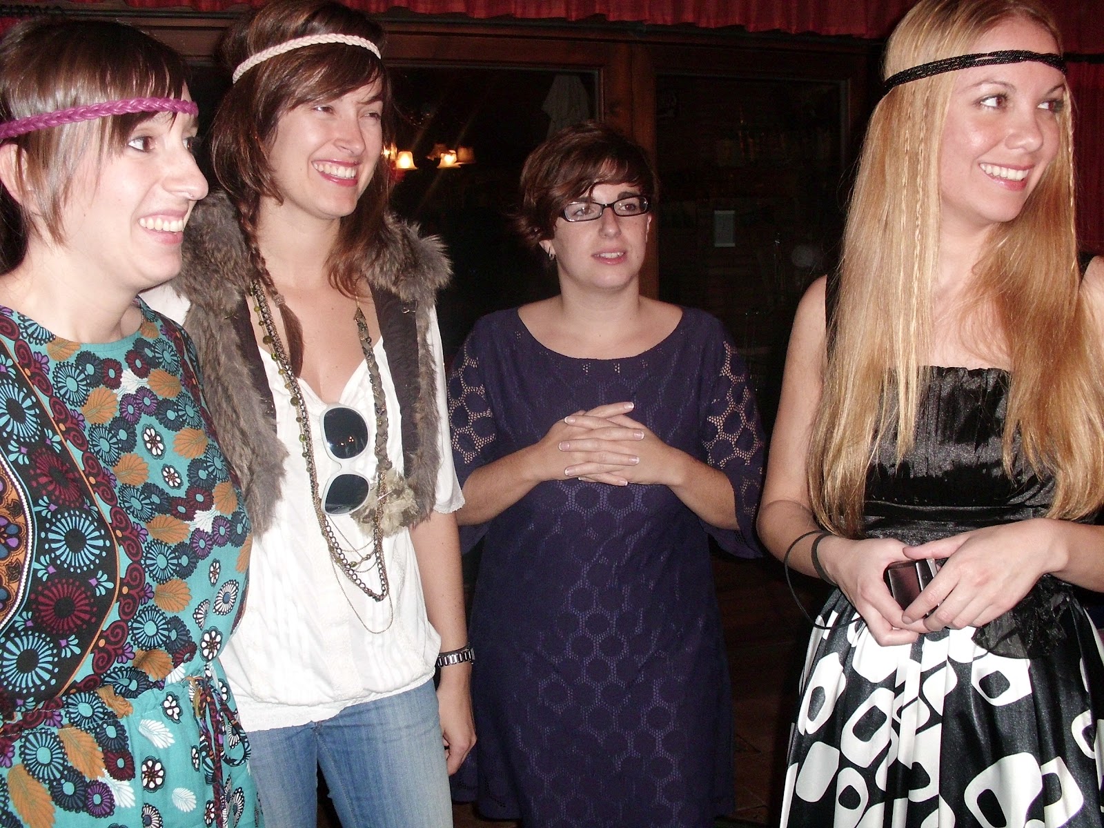 El look escogido para la cena del sábado tenía que ser ambientado en los años 60. Se entremezclaban estilos hippies, más yeyé, retros… No podían faltar gafotas de la época, vestidos monísimos tipo trapecio, pantalones de campana, cintas en el pelo, faldas a lo Olivia Newton-John… Parecía que fueran a aparecer The Beatles en cualquier momento.