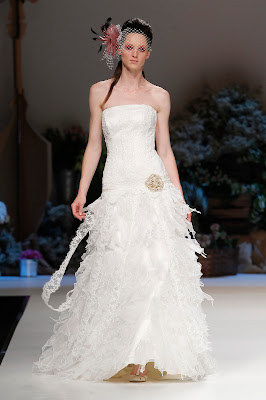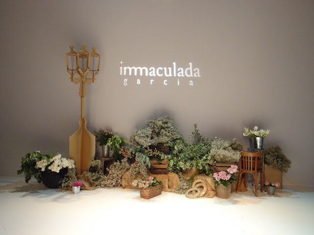 Confieso que cuando buscaba mi vestido de novia, los diseños de Inmaculada García   fueron unos de mis preferidos. Así que tenía muchas ganas de ver la nueva colección. Nos sorprendió mostrando una colección de fiesta llena de colorido y mucho movimiento en sus tejidos. Los vestidos nupciales donde entremezcla el oro viejo, con trajes con bolsillos, flecos, macramé, brocados, perlas, faldas con movimiento gracias a enormes pétalos y elaborados escotes en la espalda, hacen que sin duda sea una colección impresionante con un aire muy vintage.